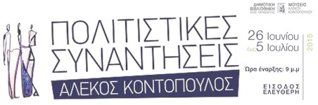 Οι "Πολιτιστικές Συναντήσεις Αλέκος Κοντόπουλος", αποτελούν  συνέχεια του καταξιωμένου και με ευρεία αποδοχή "10ήμερου Αλέκος Κοντόπουλος", από  26 Ιουνίου έως 5 Ιουλίου 2015,  στις 21:00.