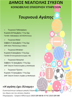 Το «Τουρνουά Αγάπης», που θα διεξαχθεί με τη συμμετοχή των παιδιών από τα αθλητικά τμήματα των Κ.Δ.Α.Π. και του μαζικού αθλητισμού, ξεκινά μεθαύριο,